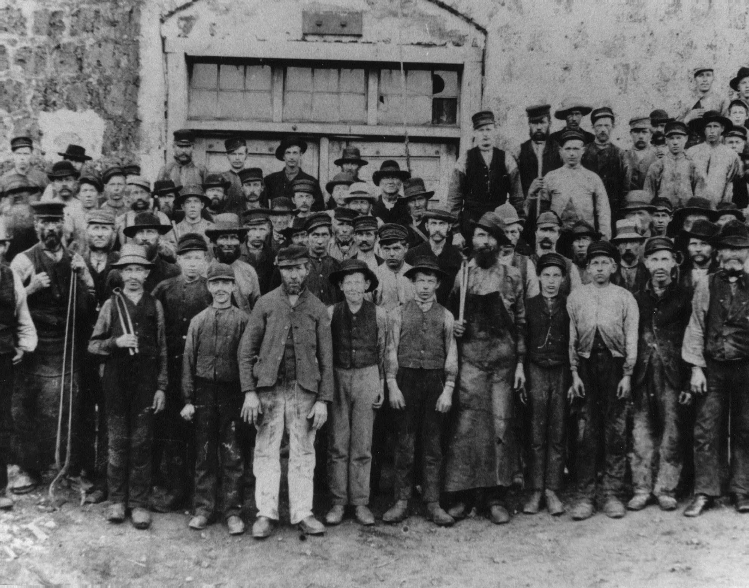 Mannlige arbeidere ved Næs Jernverk, år 1893. Hvor var de arbeidende kvinnene? Hvorfor ble det ikke tatt bilde av dem? Foto: Ukjent/Næs Jernverksmuseum.